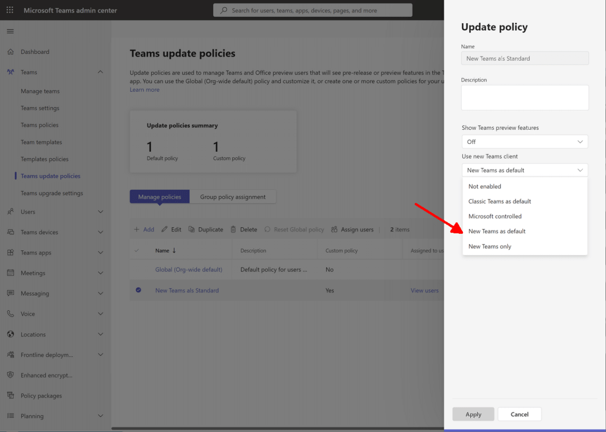 Der Rollout des neuen Clients auf alle Geräte bedeutet noch nicht, dass dieser überall sofort aktiv sein muss. Vielmehr können Admins über Policies im Teams Admin Center festlegen, welcher Client als Standard oder ausschließlich zum Einsatz kommt.