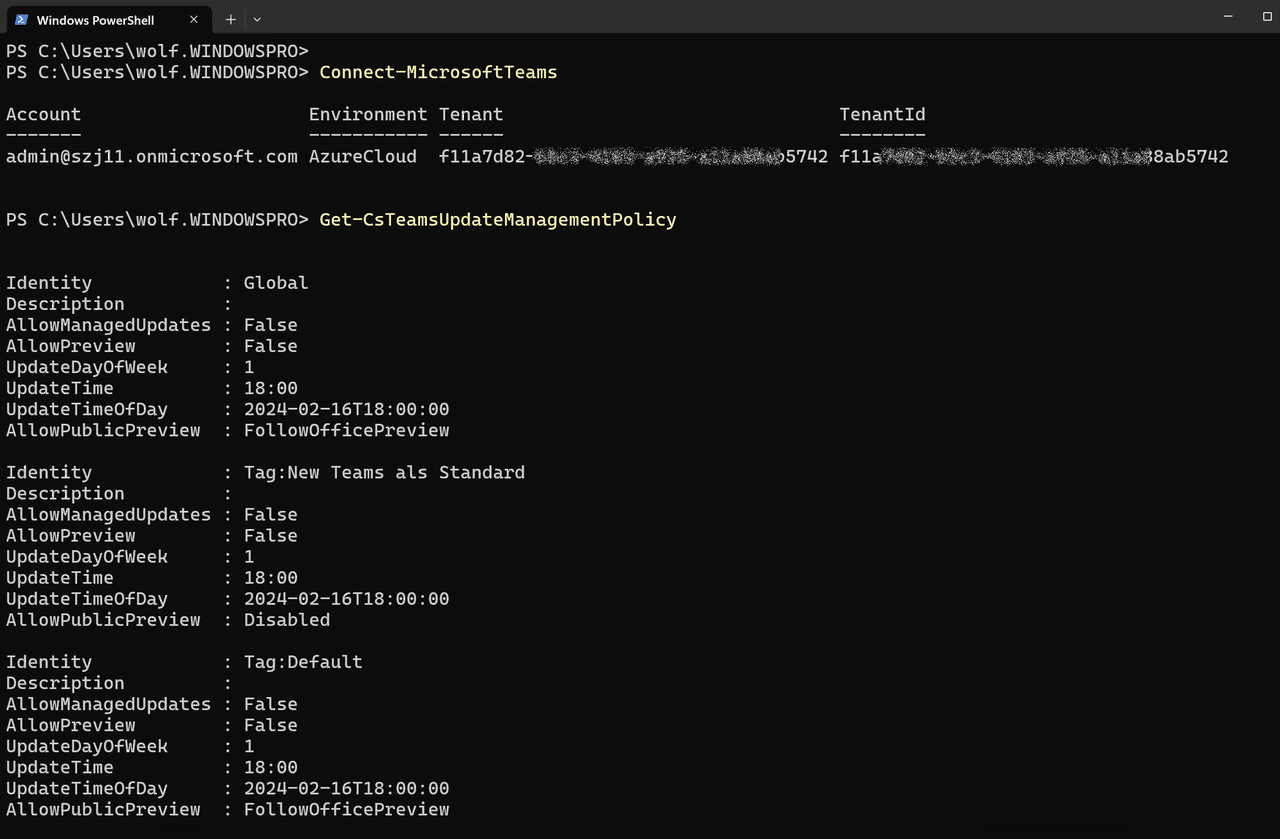 Diese Policies kann man alternativ auch über PowerShell abfragen und ändern. Das Teams-Modul enthält dazu folgende Cmdlets