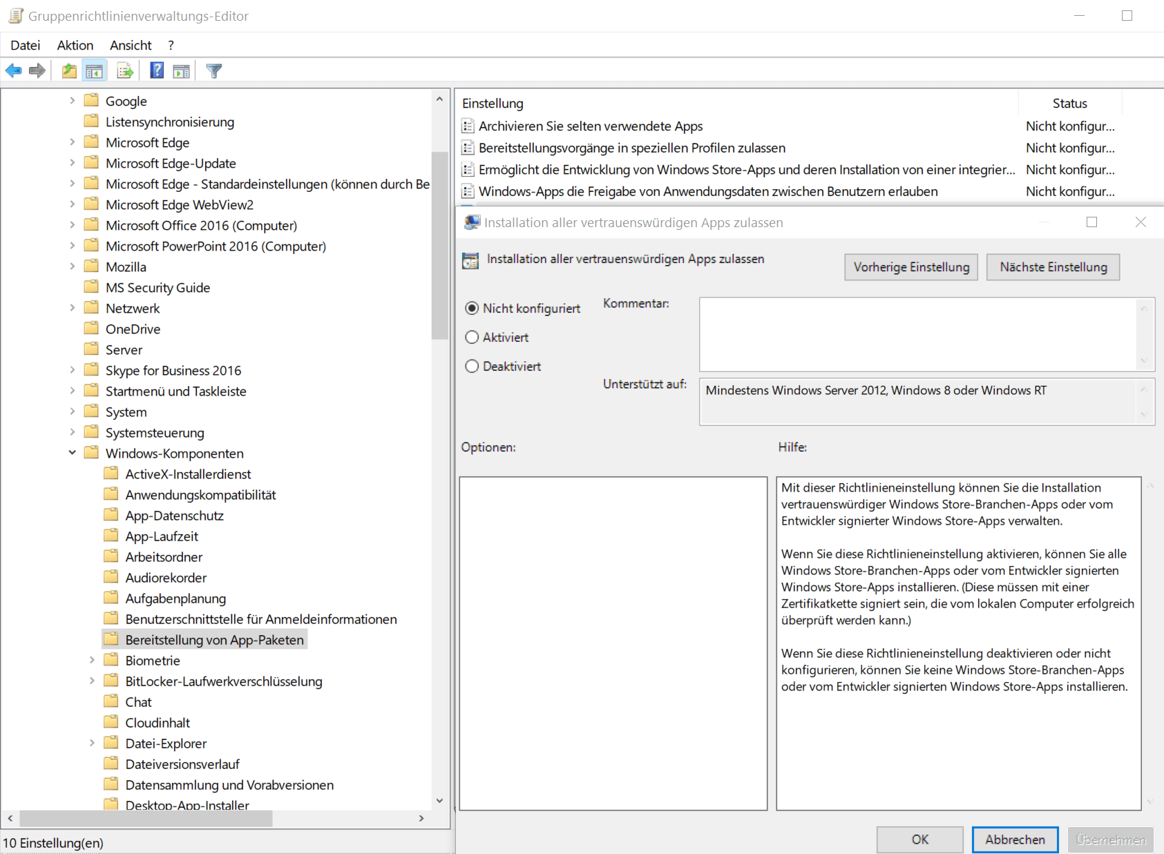 Vor dem Rollout sollte man sich überzeugen, dass auf den Zielgeräten alle Systemvoraussetzungen erfüllt sind. Dazu gehört unter anderem das Aktivieren von App Sideloading über die zuständige Gruppenrichtlinie unter Computerkonfiguration => Richtlinien => Administrative Vorlagen => Windows-Komponenten => Bereitstellung von App-Paketen:
