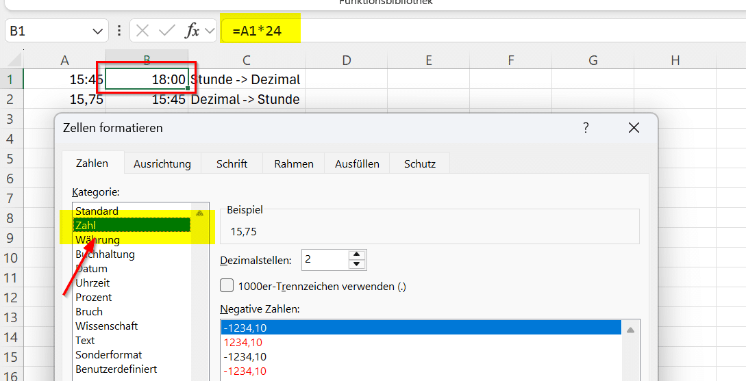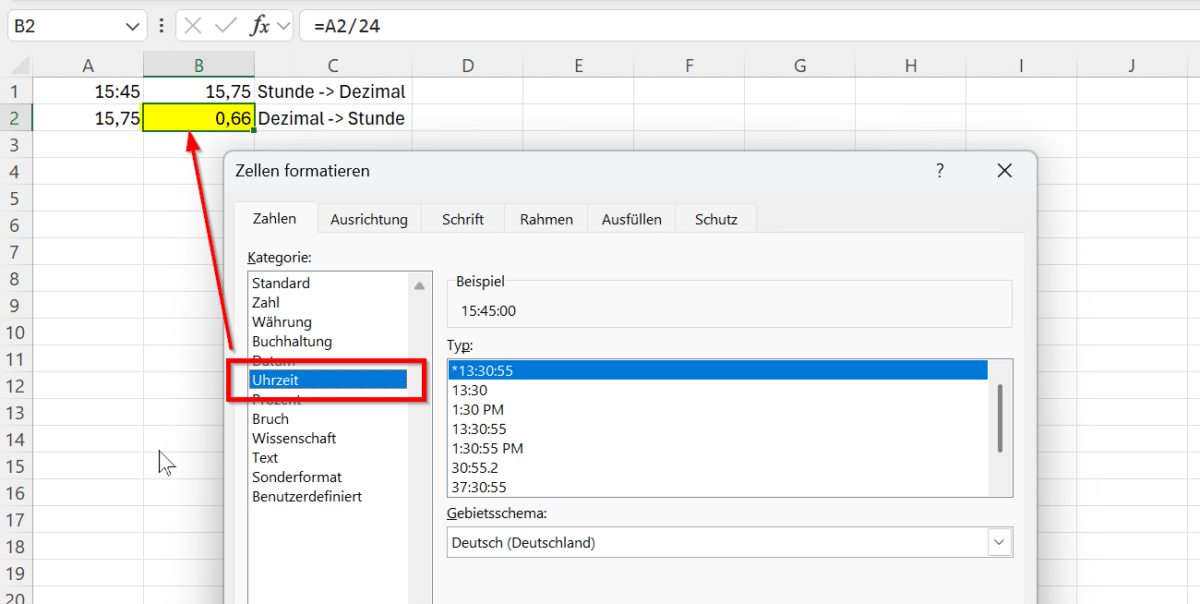 3. Formatieren: Im abschließenden Schritt formatieren Sie die Ergebniszelle B2 über Zellen formatieren – dieses mal wie im Bild als Uhrzeit.