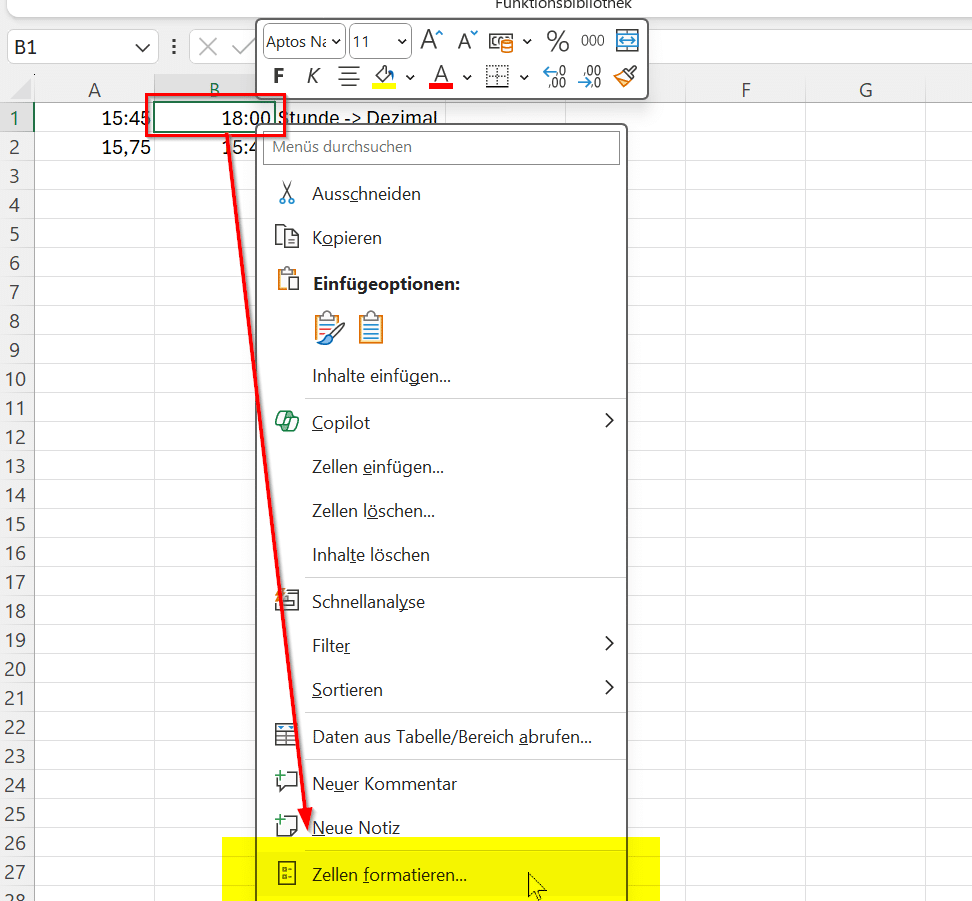 2. Zelle formatieren: Das Ergebnis „18:00“ sieht zunächst falsch aus, weil das Format der Ergebniszelle noch nicht stimmt. Sie müssen B1 nämlich auch noch als Zahl formatieren. Klicken Sie die Zelle dazu mit der rechten Maustaste auf B1 und wähle Sie im Kontextmenü unten „Zellen formatieren“.