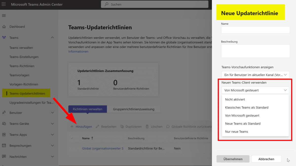 Überlässt man die Umstellung den vordefinierten Richtlinien von Microsoft, dann erfolgt diese Ende März. Im Teams-Admin Center können Sie jedoch in den Updaterichtlinien unter Neuen Teams-Client verwenden eine Änderung vornehmen.
