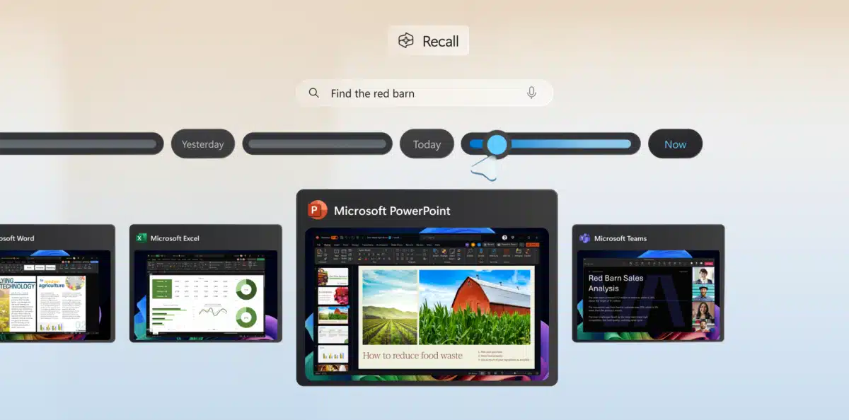 Unter den neuen KI-Funktionen sticht insbesondere „Recall“ hervor. Microsoft nennt es ein „fotografisches Gedächtnis“ für Windows. Laut technischer Beschreibung nimmt Recall alle fünf Minuten einen Screenshot auf und speichert ihn. Auf Basis der Historie aller Benutzeraktivitäten findet die KI alle bisher besuchten Webseiten, oder sie durchsucht die Ablagen der Office-Dokumente nach beliebigen Informationen.