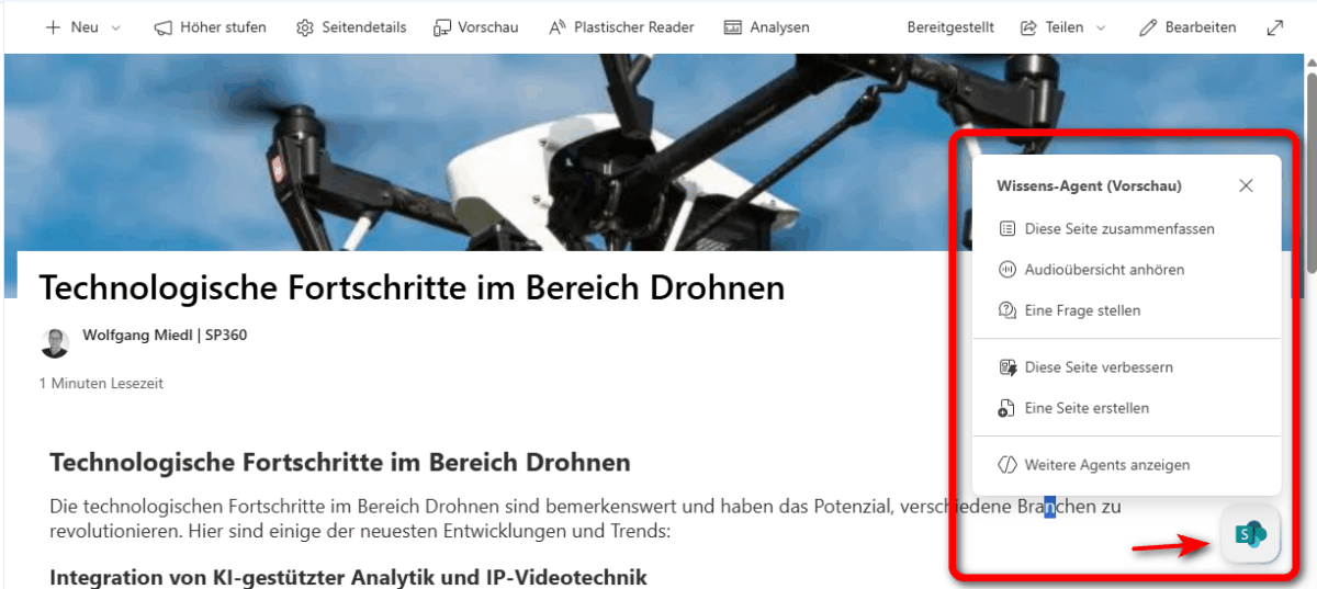 Die Verwendung des Knowledge Agents gestaltet sich recht einfach. Nach der Aktivierung erscheint auf jeder Seite rechts unten ein Bedienknopf mit SharePoint-Symbol. Das Aktionsmenü ist dabei kontextbezogen ausgelegt. Handelt es sich um eine Seite, werden KI-Funktionen wie Zusammenfassung oder Audioübersicht angeboten, oder auch Verbesserungsvorschläge für den Inhalt.