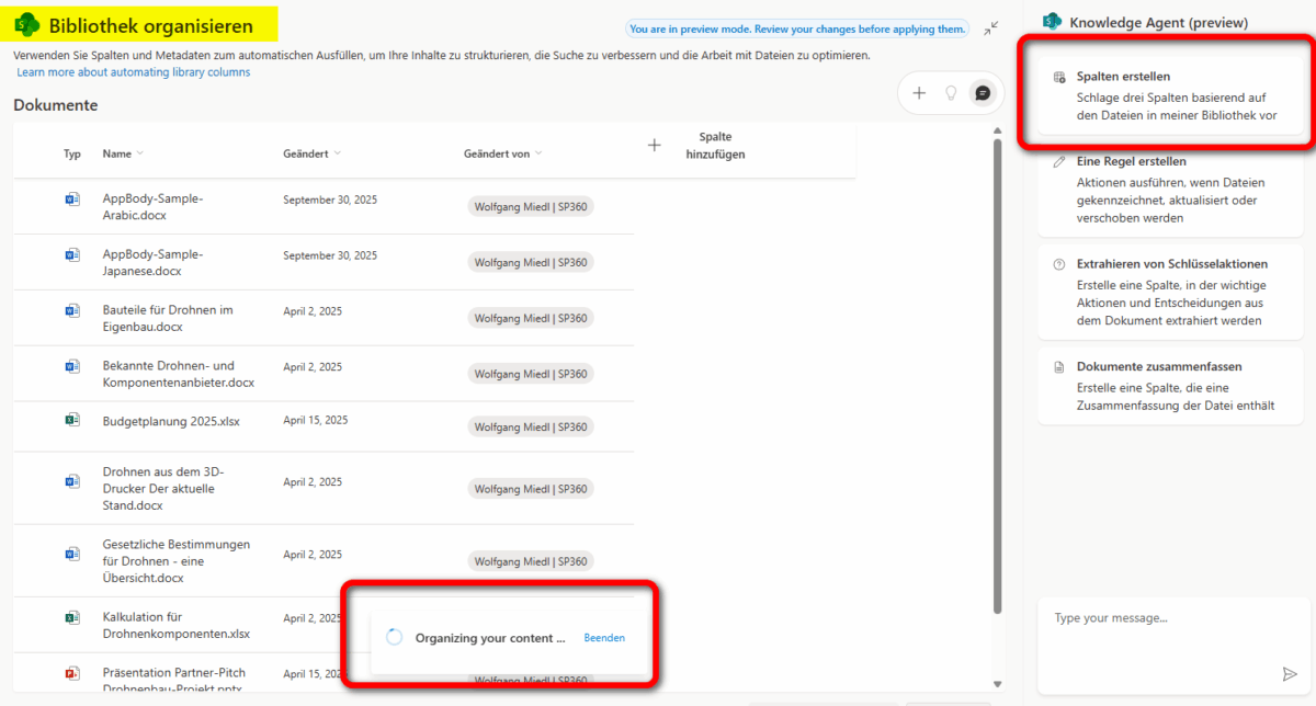 Vor allem das Organisieren von Bibliotheken bietet sehr mächtige Funktionen, um automatisch Metadaten zu generieren und auf deren Basis Spalten anzulegen und mit Inhalten zu befüllen. In unserem Beispiel wählen wir Spalten erstellen, was einen Analysevorgang auslöst, der passend zu den Dokumenten der Bibliothek zusätzliche Metadatenspalten vorschlägt.