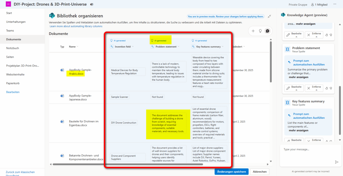 Nach dem ersten Durchlauf präsentiert der Agent eine Vorschau mit Spaltenvorschlägen und Inhalten, die aus den jeweiligen Dokumenten bezogen auf die Spaltendefinition ausgegeben wird. In unserem Beispiel sind das die drei Spalten Forschungsfeld, Problembeschreibung und eine Zusammenfassung der Schlüsselfunktionen.
