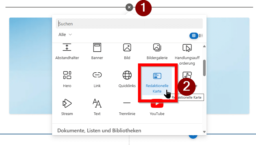 - Schalten sie auf der SharePoint-Site oben rechts auf Bearbeiten und klicken Sie im zu bearbeitenden Seitenabschnitt auf das Plus-Symbol (1), um die Auswahl der Webparts zu öffnen. Wählen Sie hier die Redaktionelle Karte.