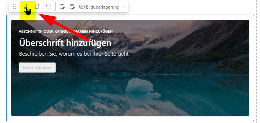 2. Das neue Webpart wird in den Abschnitt eingefügt. Sie können nun über die Schaltfläche im darüberliegenden Kontextmenü die Eigenschaften in der rechten Seitenleiste öffnen, um die weiteren Einstellungen vorzunehmen.