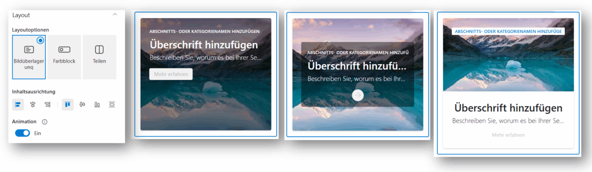 Im obersten Abschnitt Layout werden drei grundlegende Darstellungsvarianten angeboten: Bildüberlagerung (mit Hintergrundbild), Farbblock (abgesetzter Textausschnitt) und Teilen (Bild- und Textbereich getrennt).