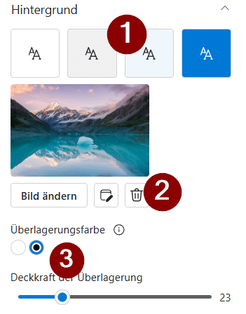 4. Im Abschnitt Hintergrund stellen Sie das Erscheinungsbild ein. Möglich sind Farbhintergründe oder Bilder. Optional lässt sich das noch mit einer flexibel transparenten Farbe überlagern.