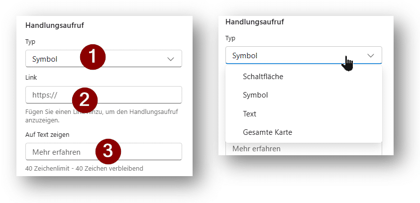 5. Unter Handlungsaufruf wird das Aussehen des Schaltknopfs oder Links festgelegt. Hier geben Sie den Typ des Links ein, mit den Auswahloptionen Schaltfläche, Symbol, Textlink oder der gesamten Karte als Link.