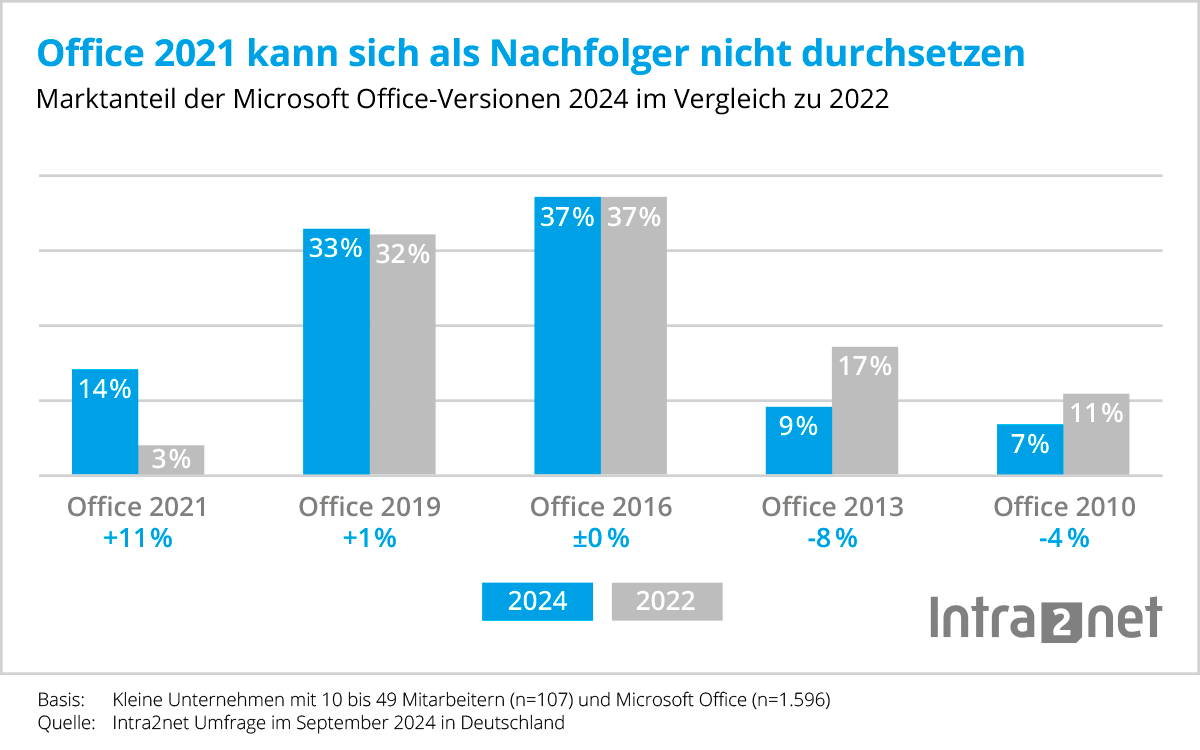 In einer Umfrage mit Unternehmen zwischen 10 und 49 Mitarbeitern hat nun der Groupware-Anbieter Intra2Net einen massiven Update-Stau ermittelt. 37 Prozent in dieser Kategorie setzen noch Office 2016 ein, 33 Prozent Office 2019 und 16 Prozent Office 2010 oder 2013. Mit Blick auf den auslaufenden Microsoft-Support für Office 2019 befinden sich damit über 80 Prozent der installierten Büro-Suiten im nächsten Jahr außerhalb der offiziellen Update-Versorgung des Herstellers.