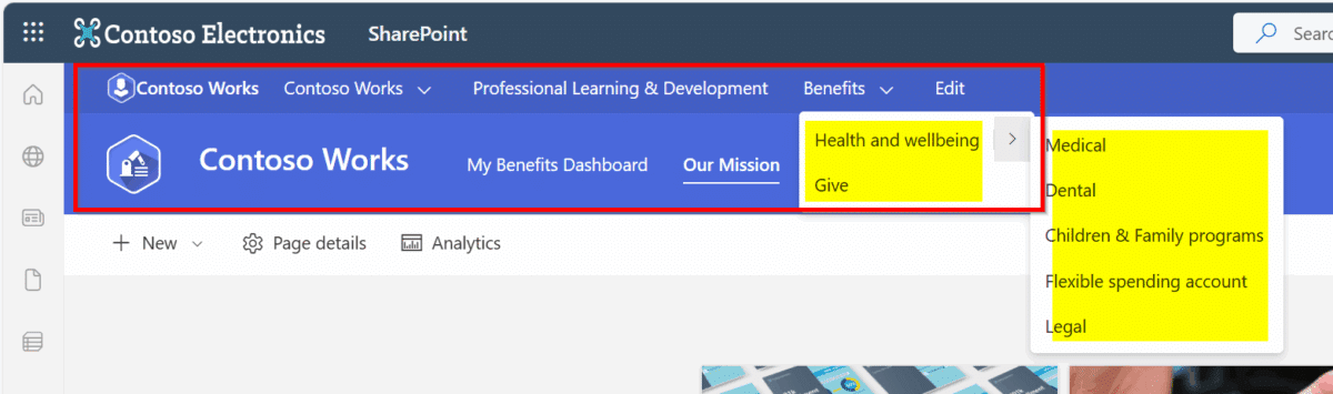 Hub-Sites erkennt man daran, dass die eine zusätzliche horizontale Navigationsleiste im Titelbereich vorweisen. Diese kann umfassend konfiguriert werden.