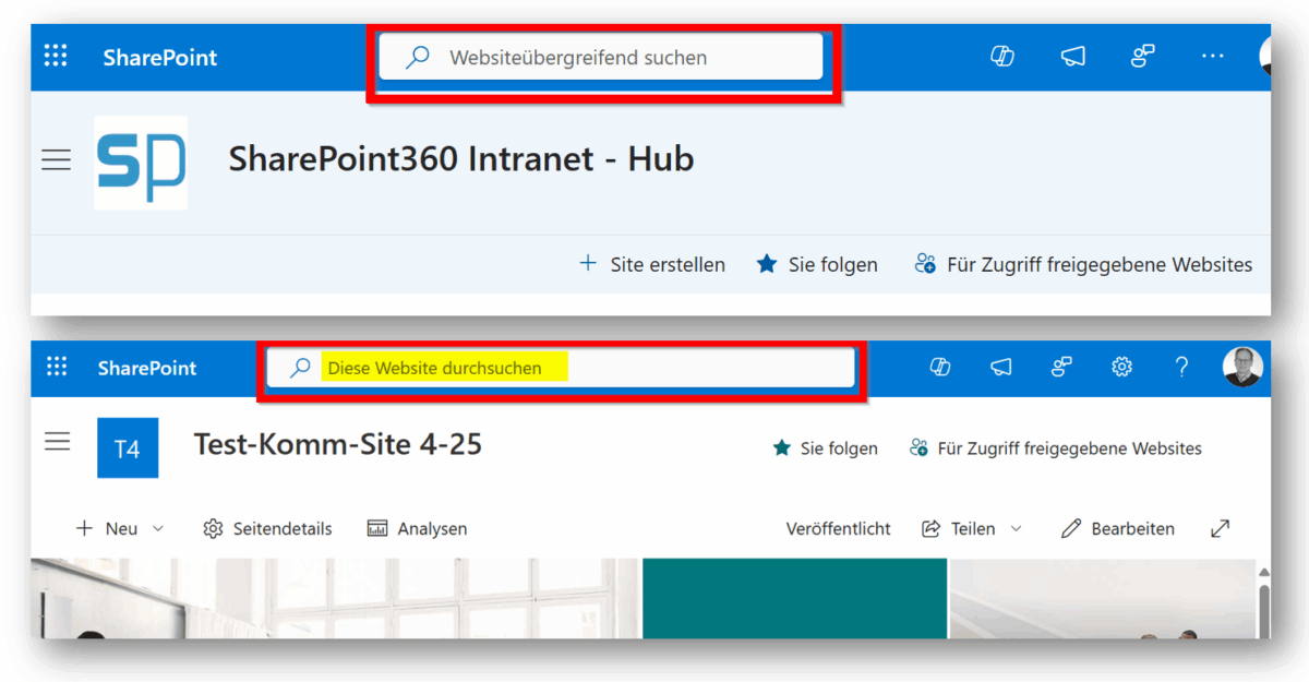 Die Suche arbeitet bei der Home-Site über alle SharePoint-Sites hinweg. Bei normalen Site-Typen beschränkt sich sich auf die Site.