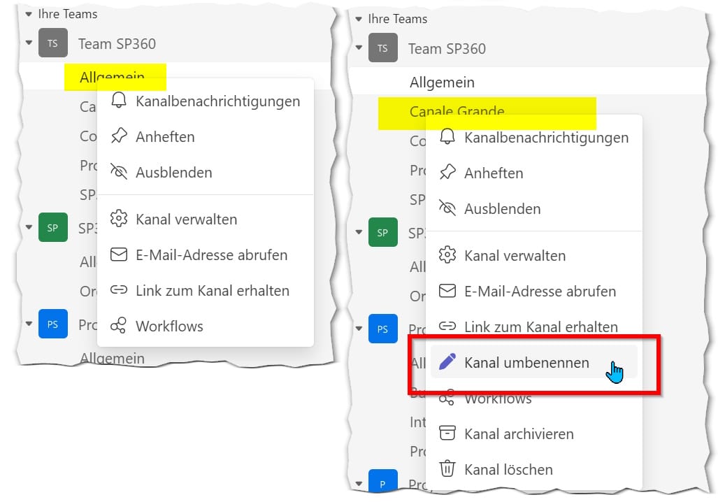 Der Kanal kann sowohl vom Team-Besitzer wie von Mitglieder mit entsprechender Berechtigung modifiziert werden. Die Anzeigereihenfolge in der Liste erfolgt in alphabetischer Sortierung.