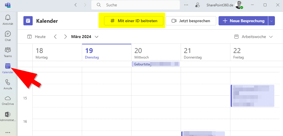 1. Eingabe im Teams-Client: Wechseln Sie hier auf die Kalender-App, und klicken Sie oben auf die Schaltfläche „# Mit einer ID beitreten“. Nach Eingabe der ID und des Passcodes sind Sie im Meeting.