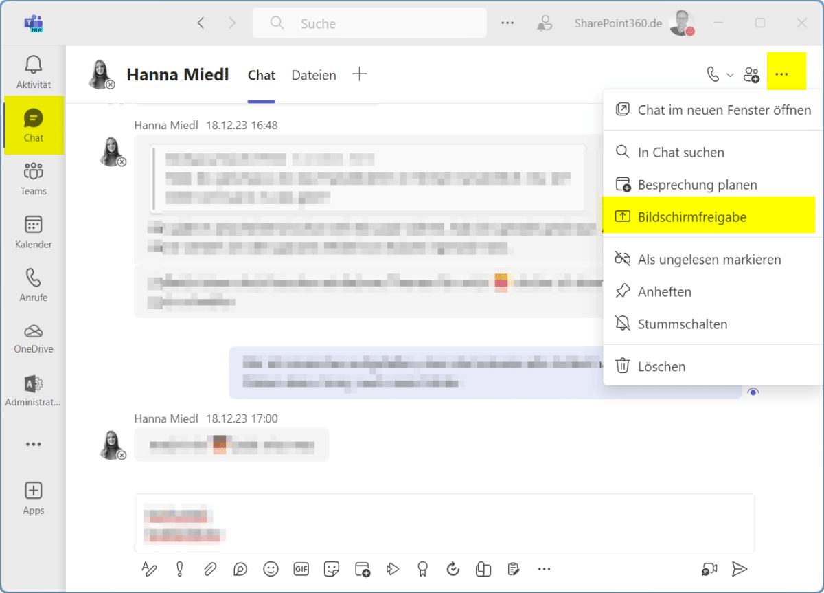 3. Schnelles Teilen des Bildschirms in einem Teams-Chat