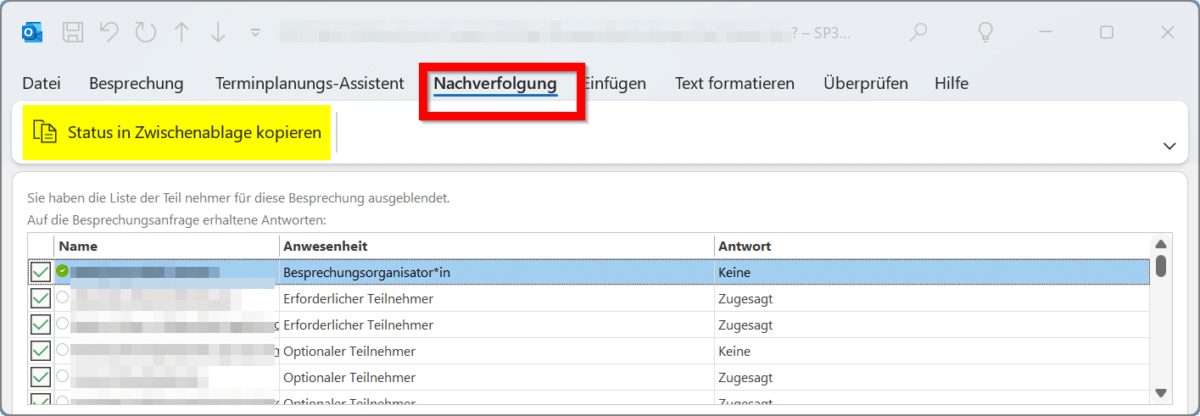 Klicken Sie darauf, um die gesamte Tabelle mit den Namen der Teilnehmer, deren Rolle (Anwesenheit) sowie deren Antwort („Zugesagt“, „Keine Zusage“, „Abgelehnt“) zu kopieren.