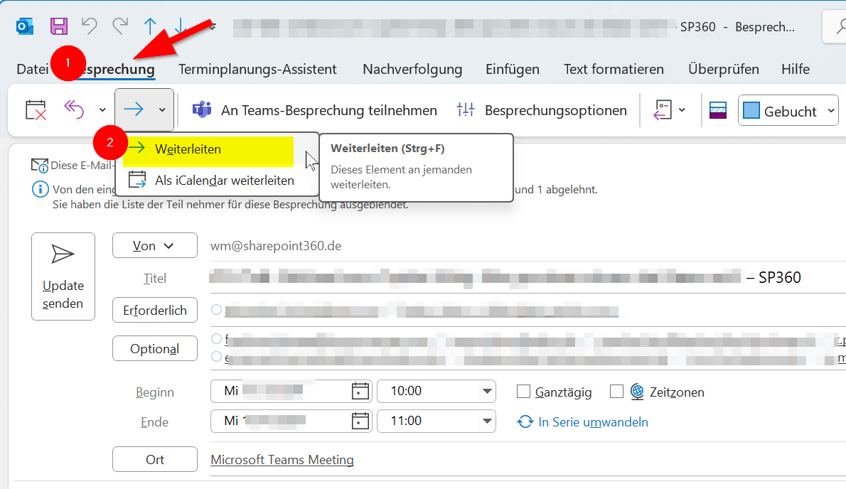 4. Wechseln Sie nun wieder in den Outlook-Kalender, in die Registerkarte Besprechung. Klicken Sie hier im darunterliegenden Menüband auf Weiterleiten.