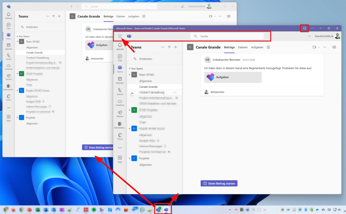 Wie der Vergleich der beiden Apps im Screenshot zeigt, lassen sich die beiden Clients auf den ersten Blick kaum unterscheiden. Als PWA behält Teams aber noch einen Teil der der Microsoft 365-Startleiste mit dem Neun-Punkte-Symbol für das Web-Startmenü.