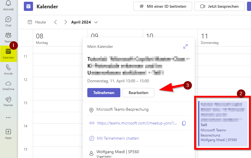 Falls Sie Informationen über Meetings betrachten und herunterladen wollen, gelangen Sie zu den Detailanzeigen über den Teams-Kalender (1). Suchen Sie hier einfach den entsprechenden Termin des Ereignisses und klicken Sie darauf (2). Betätigen Sie nun im Kontextmenü die Schaltfläche Bearbeiten (3).