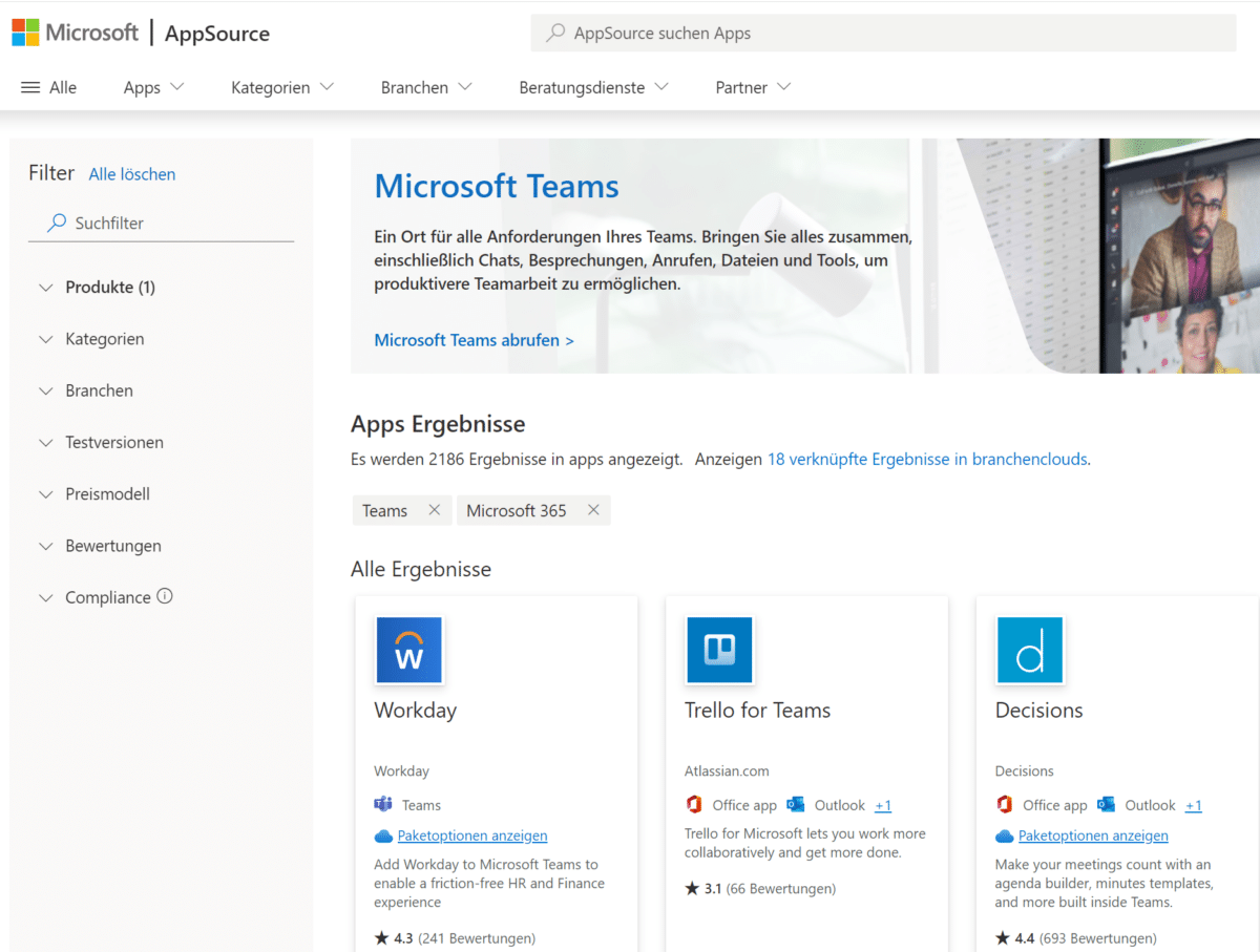 Neben den Microsoft-Apps lassen sich Apps von Drittanbietern nutzen. Diese Apps werden von unabhängigen Entwicklern im Teams Store bereitgestellt. Sorgen um Sicherheit oder Funktionalität muss man sich nicht machen. Bevor diese Apps im Teams Store verfügbar sind werden aufwendige manuelle und automatisierte Tests durchgeführt.