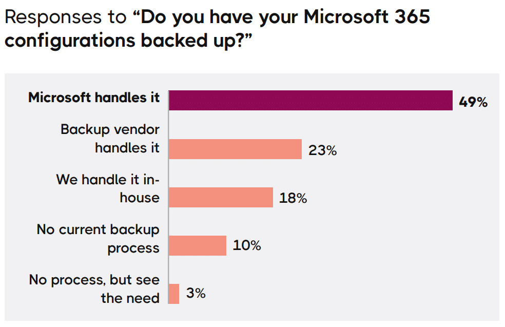 250 IT- und Sicherheitsverantwortliche wurden im Rahmen des Reports befragt. Beim Thema Sicherung der Microsoft 365-Daten gehen 49 Prozent fälschlicherweise davon aus, dass Microsoft automatisch den gesamten Tenant inklusive Konfiguration sichert. Dabei existieren lediglich einige integrierten Funktionen für die Datensicherheit, jedoch kein umfassendes Backup für Daten und Konfiguration mit der Option zur Gesamtwiederherstellung.