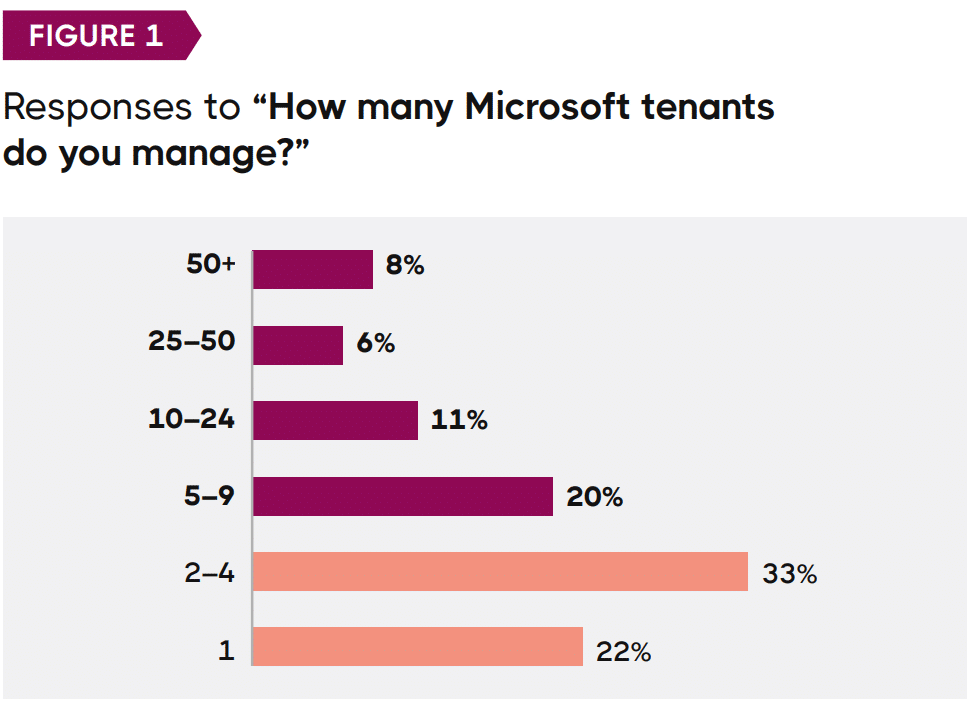 Einige der Fragen drehen sich um die Komplexität und den Aufwand für die Microsoft 365-Administration. Dabei wurde auch ermittelt, wie viele Microsoft 365-Instanzen in den jeweiligen Organisationen zum Einsatz kommen. Bei 14 Prozent sind es mehr als 25 betriebene Mandanten, 56 Prozent verwalten zwischen einem und vier Tenants.