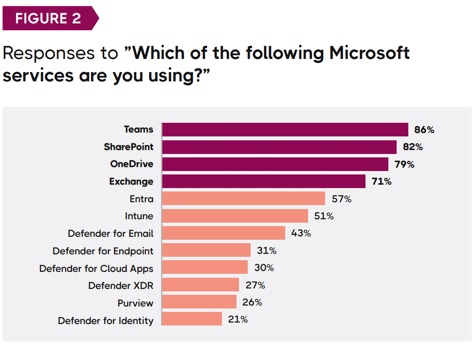 Neben sicherheitsrelevanten Fragen förderte die Coreview-Umfrage auch allgemeine statistische Erkenntnisse zutage. So etwa die über die meistgenutzten Dienste unter dem Microsoft 365-Dach. Am häufigsten genutzt wird Teams mit 86Prozent, gefolgt von SharePoint, OneDrive und Exchange.