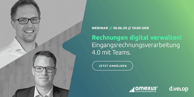 Eingehende Rechnungen sind für jedes Unternehmen ein Zeit- und Kostenfresser. Die Effizienz lässt sich jedoch deutlich steigern, wenn Sie neben der Verbesserung der technischen Prozesse auch noch eine bessere Zusammenarbeit mit Hilfe von Microsoft Teams ermöglichen. Wie Sie Ihre Eingangsrechnungen mit kollaborativen Arbeitsweisen und digitalen Abläufen optimieren, zeigt das d.velop-Webinar am 30. Juni.