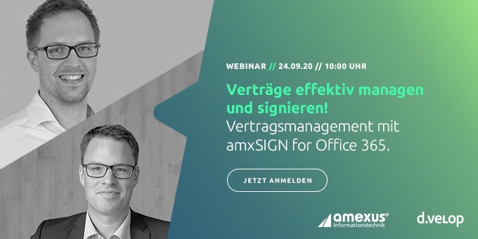 Wie Sie ein automatisiertes Vertragsmanagement mit SharePoint/Office 365 realisieren, und dabei auch die hohen eSignatur-Anforderungen erfüllen, erfahren Sie im gemeinsamen Webinar von d.velop und amexus am 24.September.